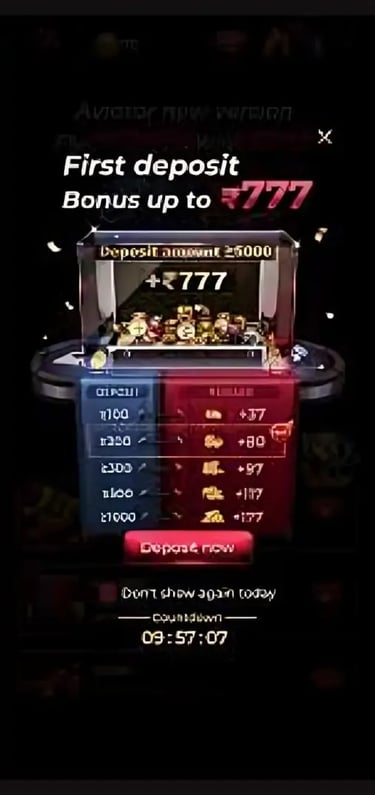 Teesra screenshot sabse zyada important hai! Yeh dikhata hai ki jab aap pehla deposit karte hain, toh aapko ₹777 tak ka shandaar bonus milta hai. Yeh bonus nayi shuruaat karne walon ke liye bahut accha hai. Is screenshot mein clear details di gayi hain ki kitni rashi (amount) deposit karne par kitna bonus milega, jisse aap turant khelna shuru kar sakte hain.